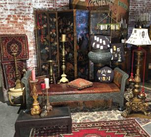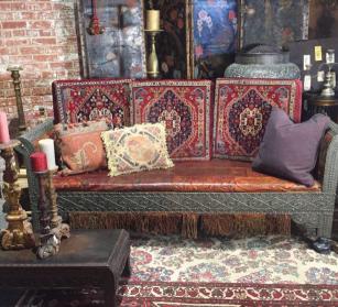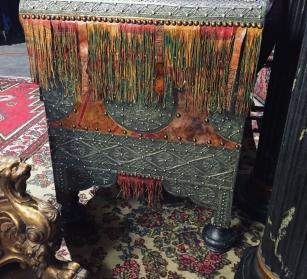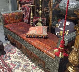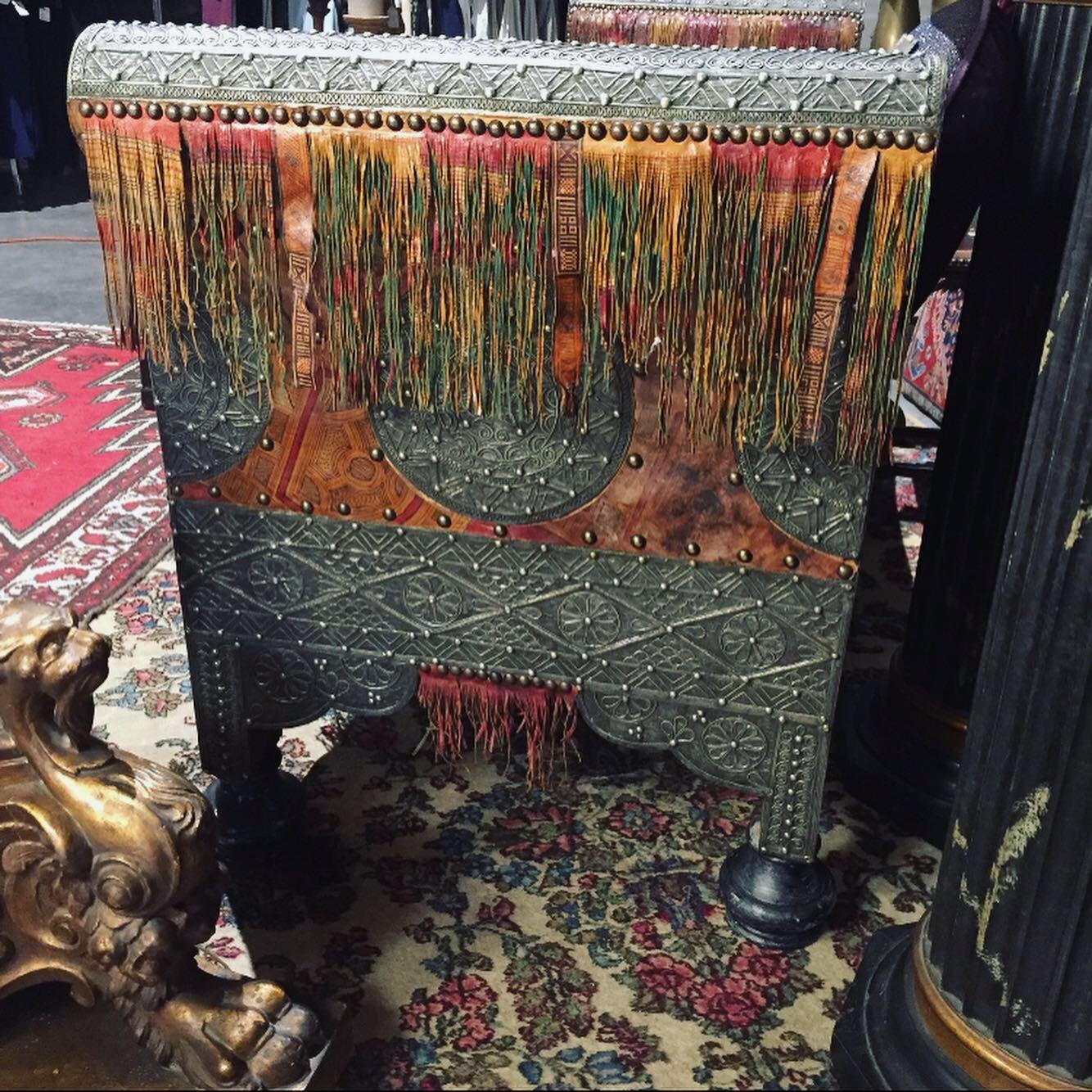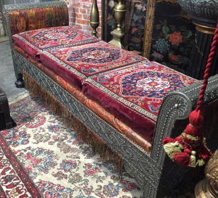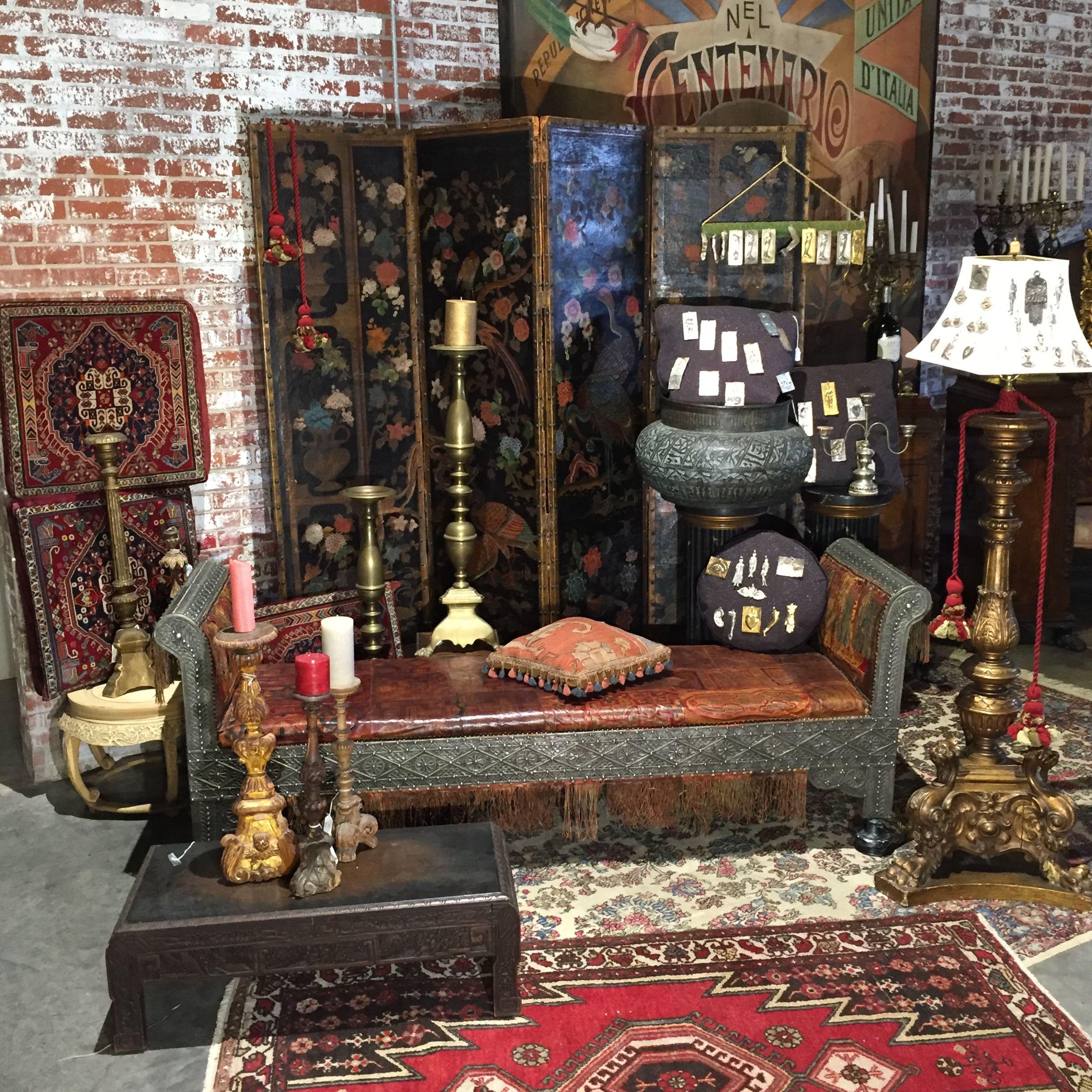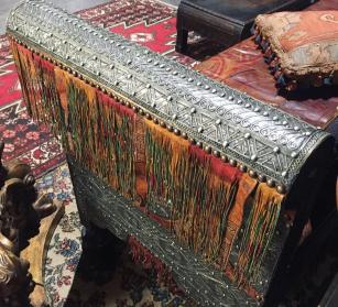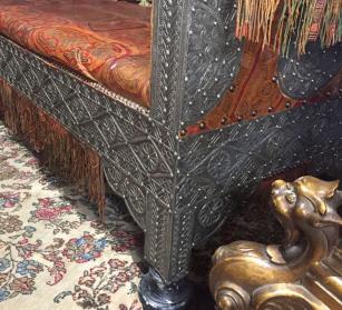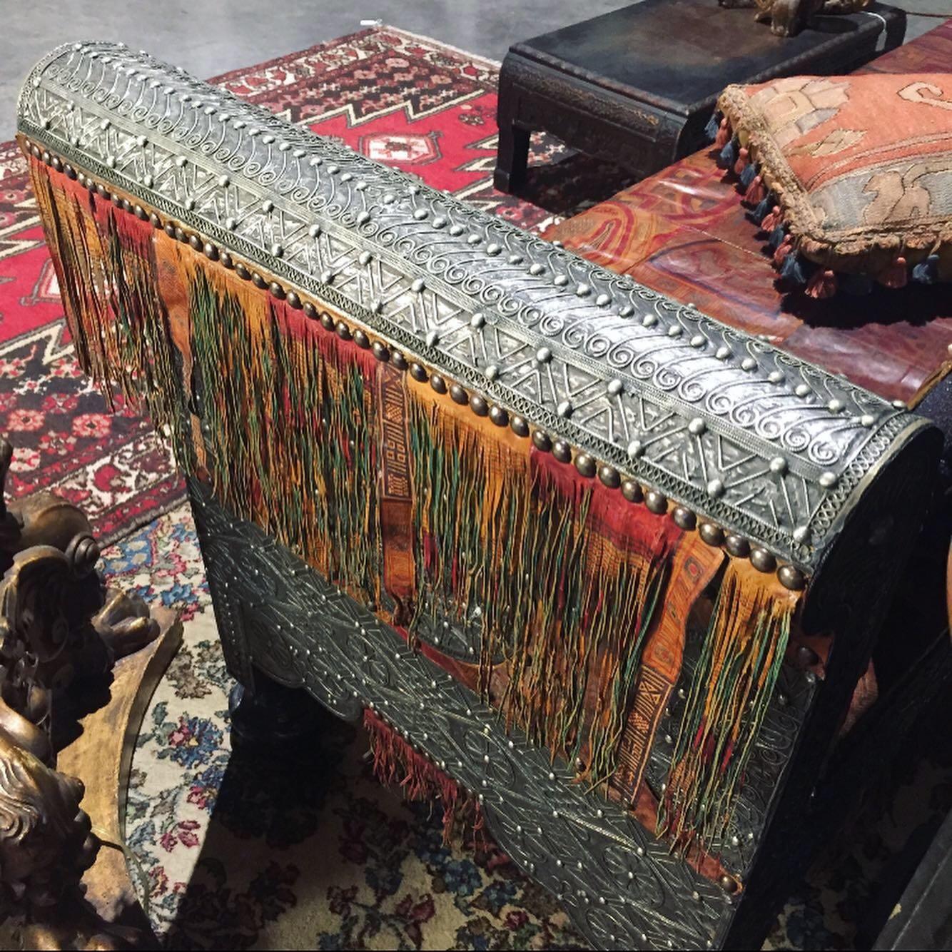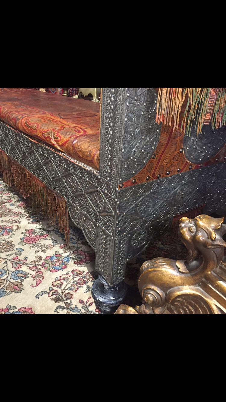 An exceptional antique Moroccan Daybed. Silver over Brass, entirely Handcrafted. An opulent example of the exotic lifestyle of Colonial Morocco. Original upholstered leather with fringe in the style of Carlo Bugatti. Three antique Turkish Rug cushions complement this fine statement piece! Now elevated on appropriate turned legs for the correct modern  height. This Boho Chic daybed is just stunning.